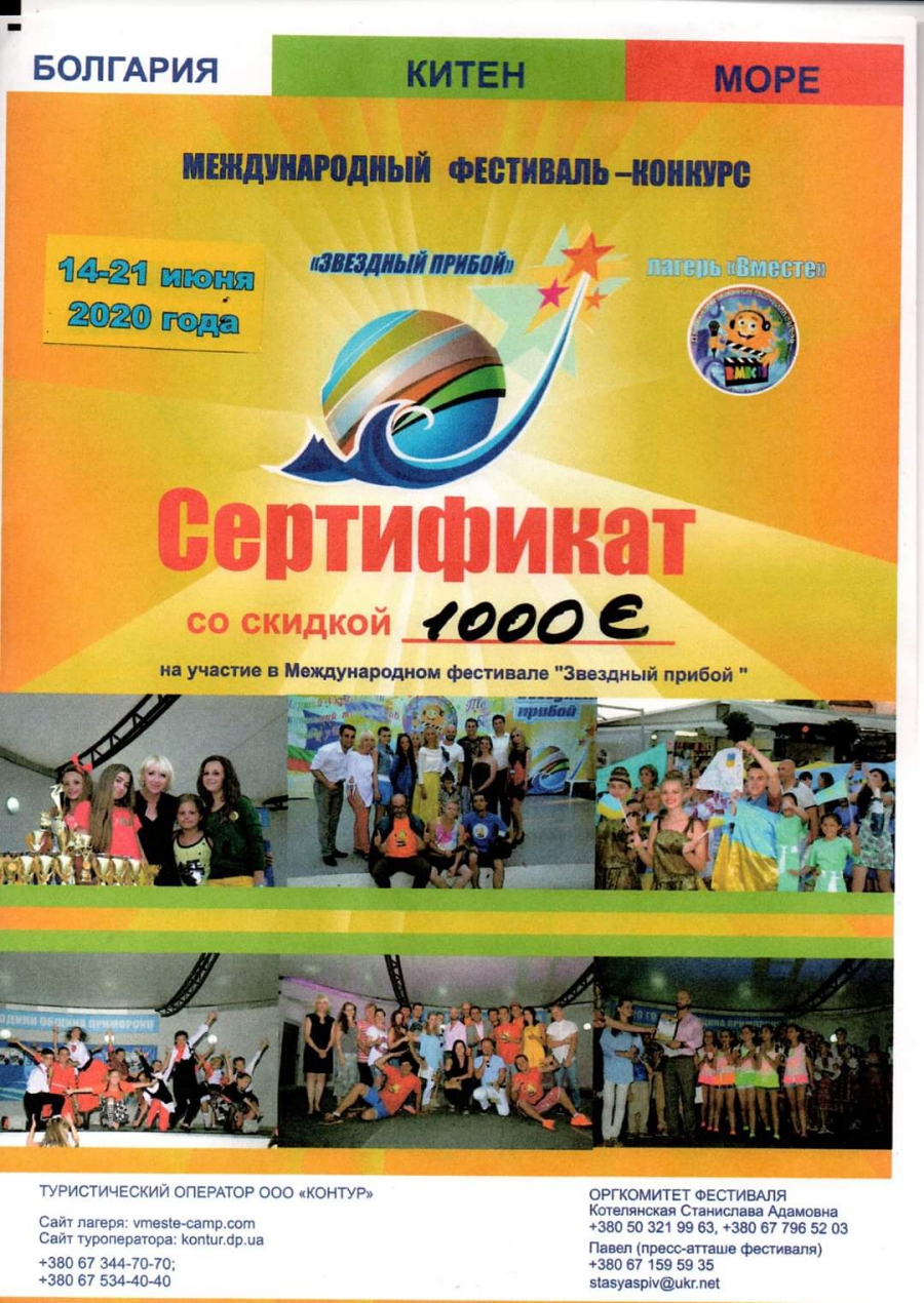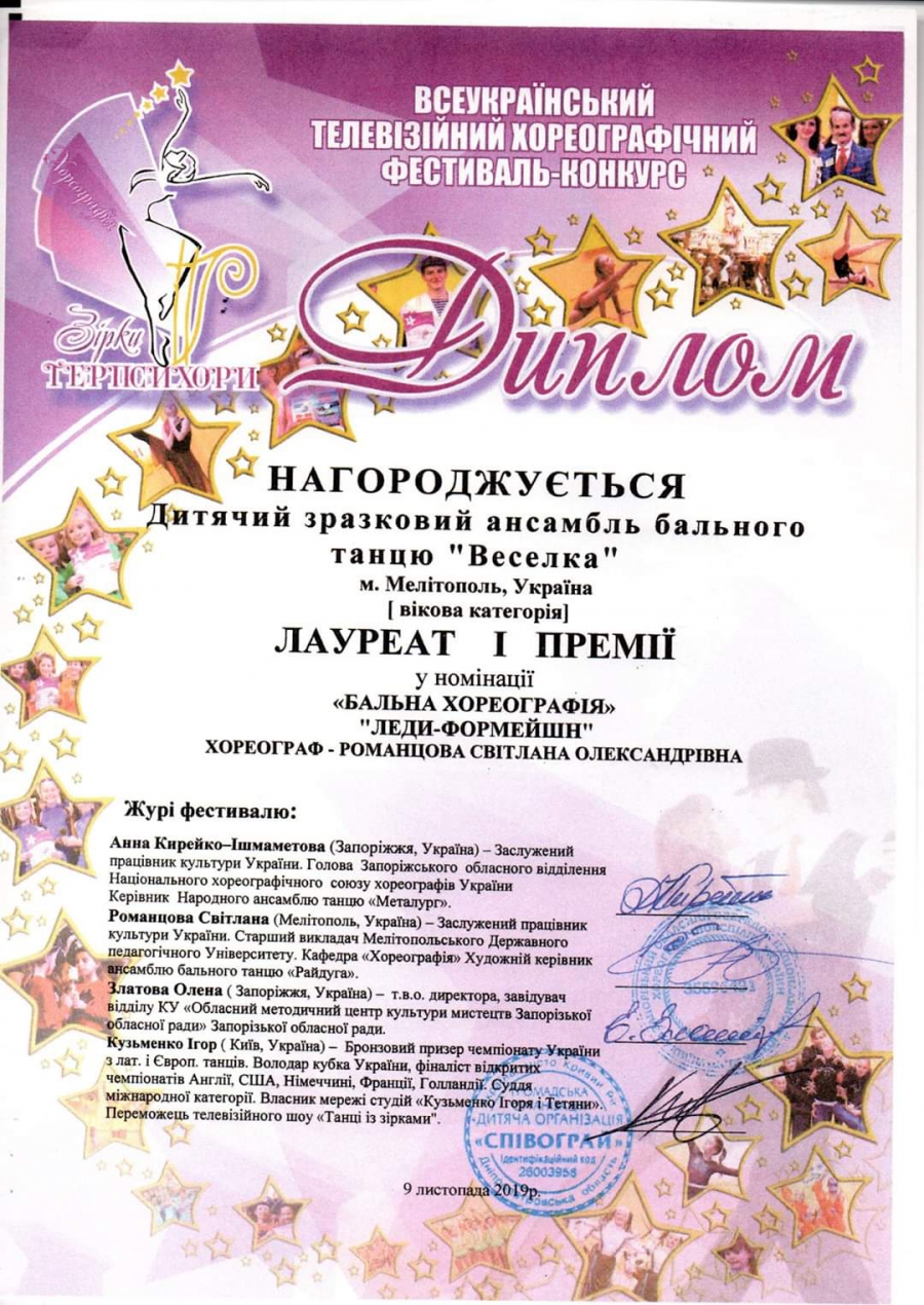Воспитанники "Радуги" достойно выступили на Всеукраинском телевизионном хореографическом фестивале-конкурсе "Звезды Терпсихоры" в Запорожье и покори жюри. Судейская коллегия без сомнения наградила мелитопольцев дипломом лауреата I премии и вручила сертификат "Скидка 1000 евро" на участие в фестивале в Болгарии.