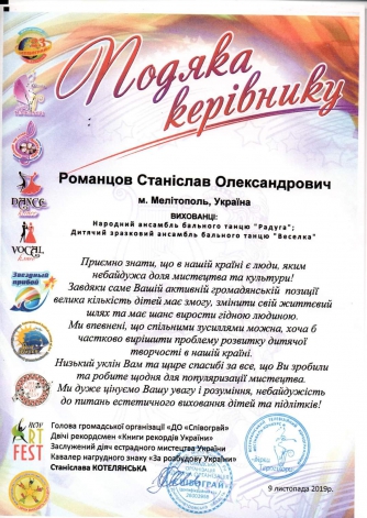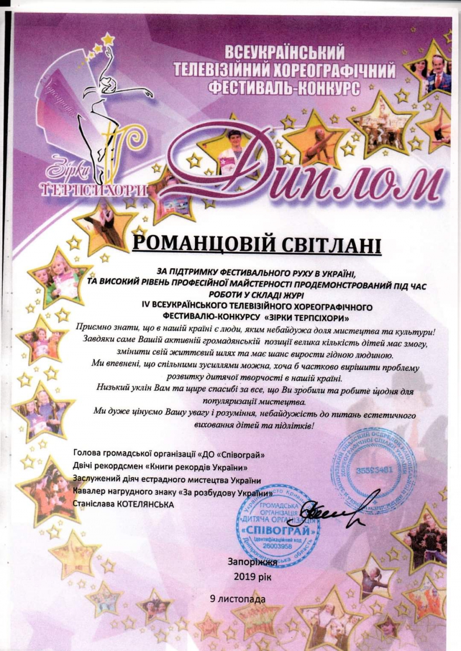 Благодарности также получили руководитель коллектива С. Романцов, а С. Романцова была награждена Диплом за развитие танцевального движения в Украине.