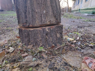 Средь бела дня мужчина начал пилить дерево возле дома № 65. Из окна это увидели жильцы и старшая по дому. Когда поднялся шум, мужчина прыгнул в автомобиль и уехал.