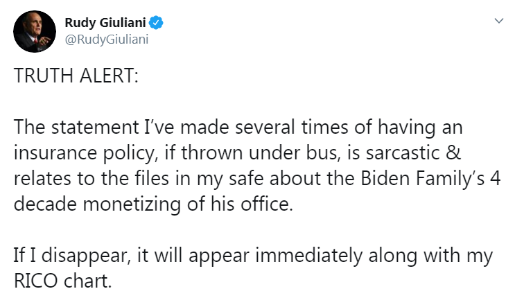 Джулиани добавил, что если он исчезнет, то хранящийся в его сейфе компромат незамедлительно будет опубликован на основании RICO, то есть Федерального закона о противодействии рэкету и коррупции.