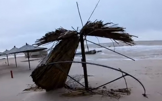 Грустно выглядят пляжи азовского курорта. Шторм разрушил или повредил много построек на берегу. Водоросли и разнообразный мусор, вынесенный волнами, устилают пляжи.