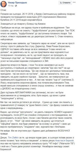 Водителя второго авто направили в Киево-Святошинскую больницу, и журналисты решили попасть к нему, чтобы узнать о его состоянии. Но в приемном их не пустили, директор сослался на "тайну следствия", а вскоре после прибытия СМИ к больнице приехали вооруженные люди. Об этом пишет журналист Назар Приходько.
