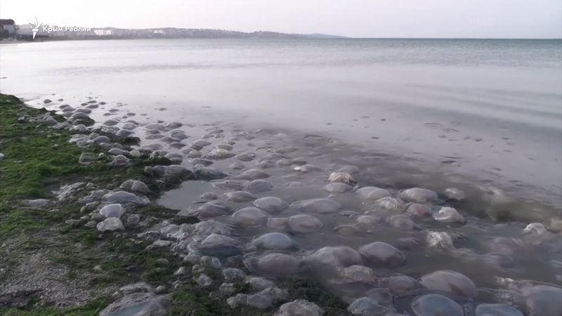 Тысячи медуз вынесло на побережье Азовского моря в селе Мысовое Ленинского района оккупированного Россией Крыма.