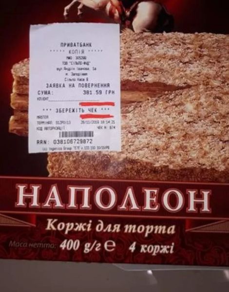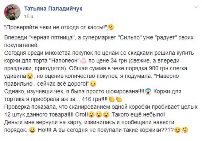 Изучив чек внимательнее, горожанка была попросту шокирована. Оказалось, что на кассе вместо одной упаковки коржей для торта автоматически “пробилось” еще 12 штук. Таким образом она заплатила 416 гривен вместо 34. Девушка написала заявление на возврат средств и решила предупредить горожан о подобных “сюрпризах”.