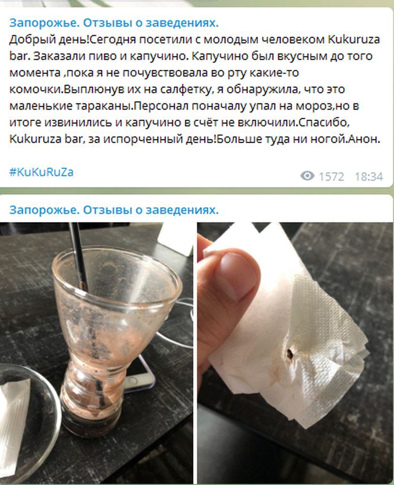 По их словам, они заказали в одном из кафе, расположенном в центре Запорожья, пиво и капучино. Девушка начала пить свой кофейный напиток и почувствовала во рту комочки. Когда она выплюнула их на салфетку, то оказалось, что это были тараканы.
