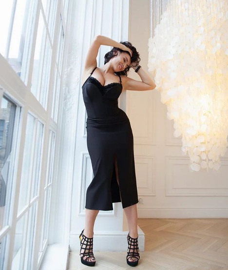 На странице в Instagram артистка опубликовала фото в блестящем черном наряде с очень глубоким декольте, которое подчеркнуло пышную грудь Мейхер.