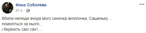 Жена Вячеслава Соболева Инна впервые выразила эмоции после смерти сына Саши. Свой пост она опубликовала на странице в Facebook.
