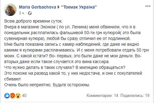 С женщины потребовали 50 гривен и начали обвинять ее в мошенничестве. Жительница Токмака попросила совета у пользователей соцсети и задалась вопросом, как правильно поступать в подобной ситуации. В комментариях под постом люди посоветовали не раздумывая вызывать полицию и назвали данную ситуацию “очередным разводом