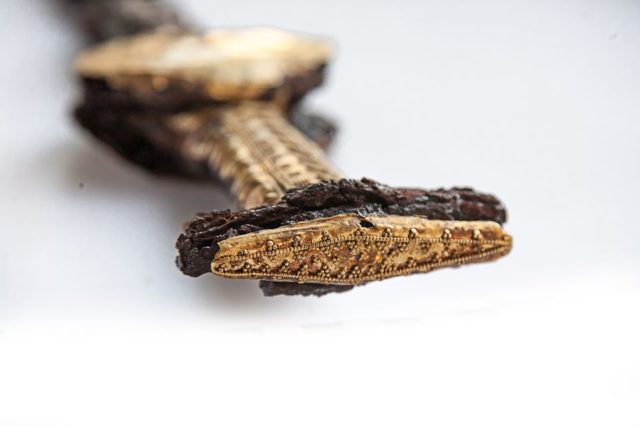В отчете археологов также отмечается, что фрагменты акинака подбирали на протяжении 10 дней, а нанесение защитного слоя на поверхность находки наносилось щетинной кистью.
