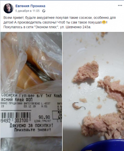 На днях в популярной социальной сети появился пост о том, что жительница Запорожья обнаружила в купленных сосисках элементы железной проволоки. Товар был приобретен в Шевченковском районе Запорожья.