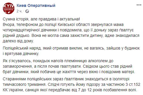 Вчера, 7 декабря, в отделение полиции Киевской области обратилась мать 14-летней девочки, которая сообщила, что ее дочь насилует родной дядя.