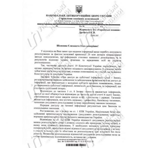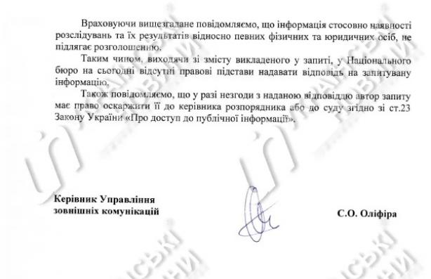 "В соответствии со ст. 222 УПК Украины сведения досудебного расследования можно разглашать только с разрешения следователя или прокурора и в том объеме, в котором они признают возможным. В необходимых случаях следователь, прокурор предупреждает лиц, которым стали известны сведения досудебного расследования, в связи с участием в нем, об их обязанности не разглашать такие сведения без его разрешения", - говорится в ответе НАБУ.