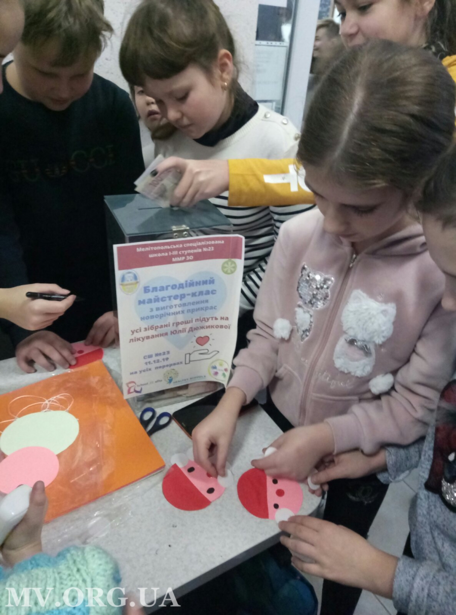 На переменах школьники, педагоги, сотрудники школьной столовой и даже родители участвовали в мастер-классах по созданию новогодних игрушек. Цену за них каждый устраивал индивидуально, а все вырученные средства будут направлены родным Ю. Дюжиковой, которой требуется дорогостоящая операция по пересадке костного мозга за границей.