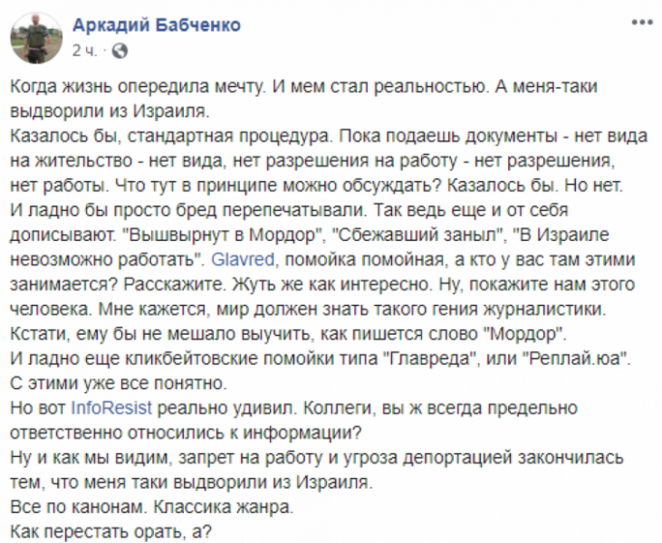 "Когда жизнь опередила мечту. И мем стал реальностью. А меня-таки выдворили из Израиля", – сообщил Бабченко.