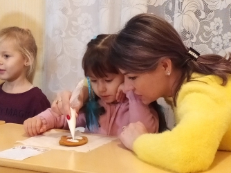 В пряничной мастерской проходил мастер-класс по росписи. Дети вместе с родителями с удовольствием осваивали искусство росписи пряников под руководством Ирины Тупиковой и Елены Гулевской.