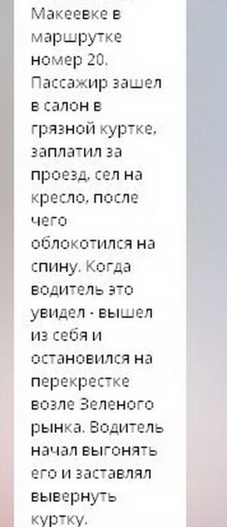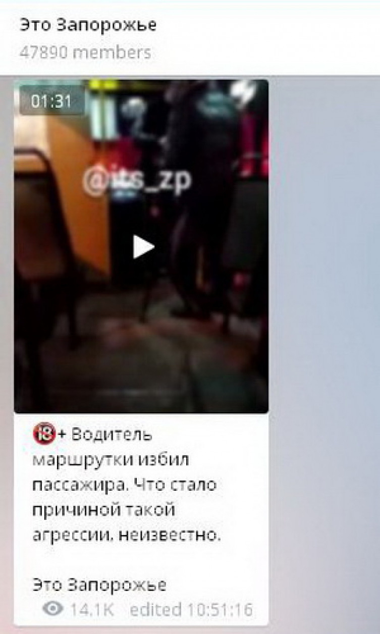 В запорожских соцсетях, а следом и в ряде украинских СМИ появилось видео, в котором водитель маршрутки, нецензурно выражаясь, а также употребляя чисто русские обороты вроде "лыком шиты", бьет пассажира на костылях. Набросился на него за то, что у мужчины якобы грязная куртка и заставляет ее снять. Видео распространяется, как снятое в запорожском автобусе. На самом же деле происшествие случилось в оккупированной русскими Макеевке и было обнародовано еще 14 декабря каналом "Типичный Донецк" в Телеграм.