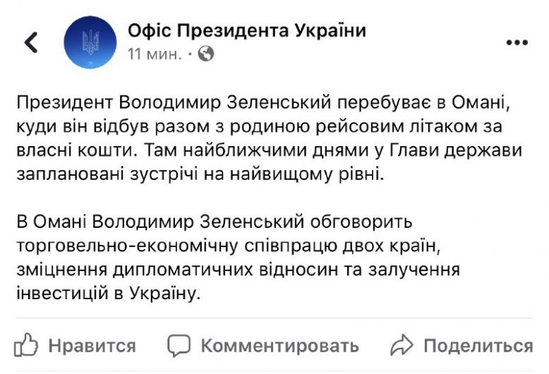 “Президент Владимир Зеленский находится в Омане, куда он отбыл вместе с семьей рейсовым самолетом за собственные средства. Там в ближайшие дни у главы государства запланированы встречи на высшем уровне. В Омане Владимир Зеленский обсудит торгово-экономическое сотрудничество двух стран, укрепления дипломатических отношений и привлечения инвестиций в Украину”, – говорится в сообщении.