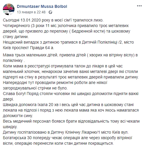 В Киеве, в помещении детской поликлинике №2 на проспекте Правды, 2а, маленький ребенок получил серьезные травмы из-за обрушившейся на него двери. Детали происшествия рассказал отец пострадавшего мальчика, известный сирийский врач Альбольболь на своей странице в Facebook.