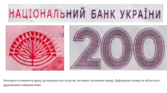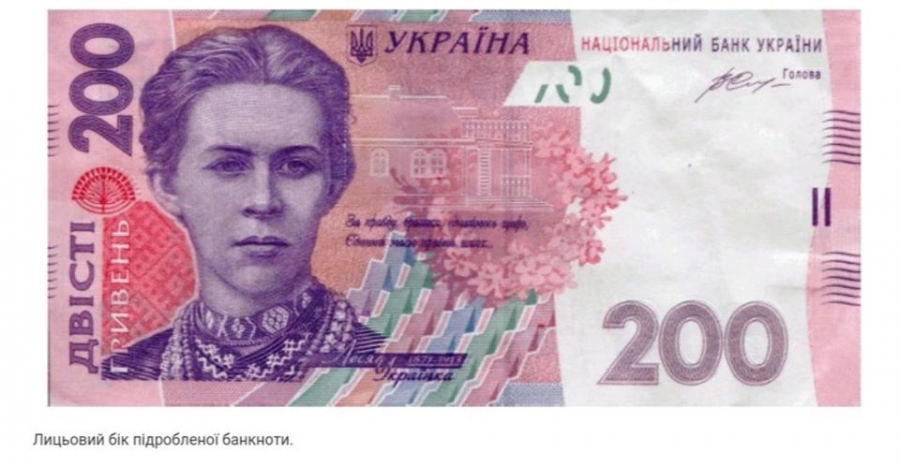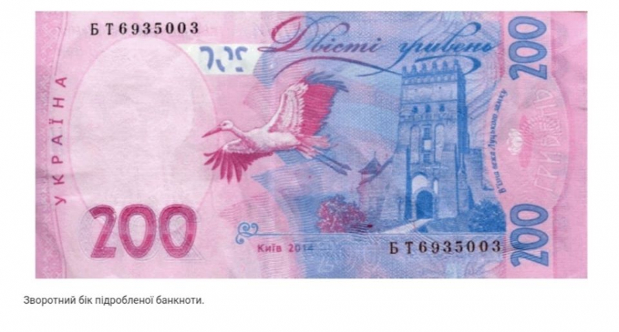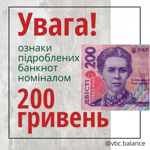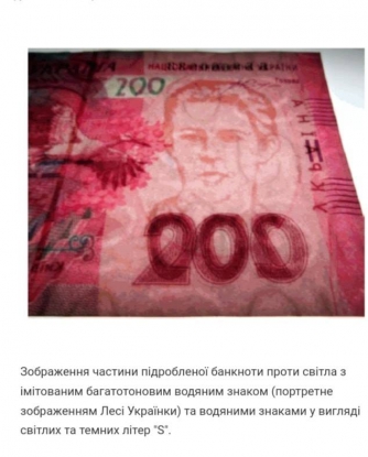 Департамент грошового обігу Національного банку повідомляє про вилучення з обігу нового варіанту підроблених банкнот номіналом 200 гривень зразка 2007 року (рік на банкнотах 2014), що виготовлені на папері з двотоновими водяними знаками у вигляді літер "S".