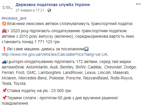 В 2020 году автомобили 2015 года выпуска, стоимость которых составляет более 1 771 125 миллионов гривен, будут подлежать налогообложению. Такое решение коснется 172 марок машин, среди которых LandRover, Lexus, Audi, BMW, Mercedes-Benz, Porsche и другие.