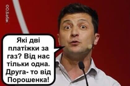 В очередной раз в сети появился мем с удивленным лицом Зеленского, который сообщает украинцам, что не знает ни о каких двух платежках на газ. От них только одна платежка, а вторая от Порошенко.