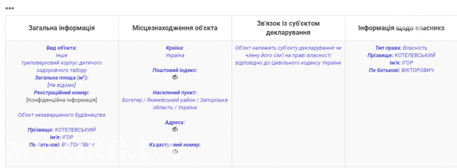 Что же касается недвижимости, то у Котелевского есть квартира в Токмаке, жилой дом на 180 «квадратов» и земельный участок в Червоногорке Токмакского района и право пользования еще одной небольшой квартирой в Токмаке на 32 квадратных метра. У жены есть на праве собственности и в аренде еще 5 земельных участков. А еще предпринимательница Савицкая является владелицей рыночного комплекса и двух нежилых помещения в Токмаке. Также мэр Токмака указал, что ему принадлежит недостроенный трехэтажный корпус детского оздоровительного лагеря в селе Богатыр Акимовского района.