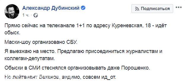 "Прямо сейчас на телеканале 1+1 по адресу Куреневская, 18 - идёт обыск. Маски-шоу организовано СБУ. Я выезжаю на место. Предлагаю присоединиться журналистам и коллегам-депутатам. Обыски в СМИ стеснялся организовывать даже Порошенко. Но лейтенант Баканов, видимо, совсем ид_от", - не сдержал чувств политик.
