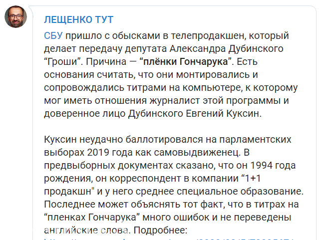 "Есть основания считать, что они монтировались и сопровождались титрами на компьютере, к которому мог иметь отношения журналист этой программы и доверенное лицо Дубинского Евгений Куксин", - написал Лещенко в Telegram.