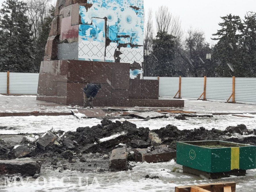 На площади Запорожской, на которой долгие годы возвышался над ДнепроГЭСом Ильич, появилась строительная техника, работает экскаватор который убирает бордюры, рабочие с помощью строительного инструмента демонтируют гранитные плиты вокруг постамента. Работы по демонтажу должны закончиться в течении недели, если не помешают плохие погодные условия.