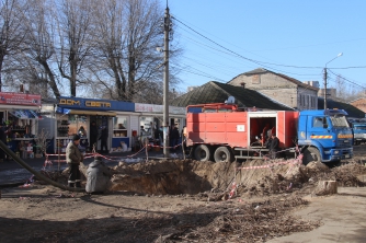 В частности, на участке вдоль рынка продолжается ремонт коллектора. Здесь собрано много техники и много работников. А минутку отдыха предпочитают проводить время с телефоном или сигареткой в зубах.