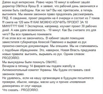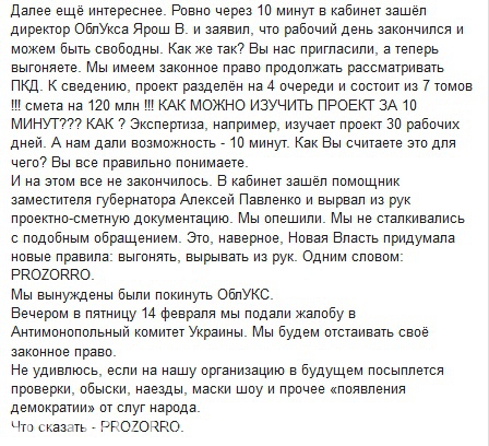 И на этом все не закончилось. В кабинет зашёл помощник заместителя губернатора Алексей Павленко и вырвал из рук проектно-сметную документацию. Мы опешили. Мы не сталкивались с подобным обращением. Это, наверное, Новая Власть придумала новые правила: выгонять, вырывать из рук. Одним словом: PROZORRO", - говорится в сообщении.