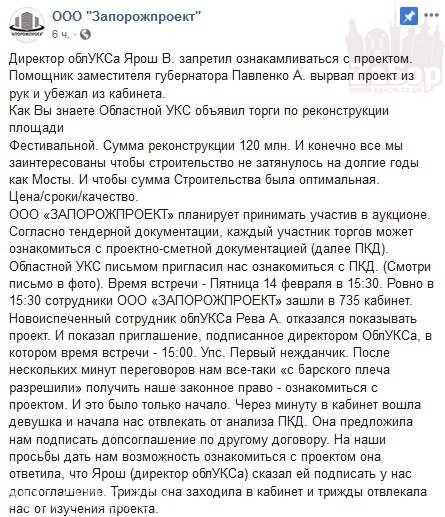 Как сообщается на странице ООО "Запорожпроект", в пятницу, 14 февраля, на 15.30 их пригласили ознакомиться с проектно-сметной документацией объекта, но, когда они пришли, им выделили только 10 минут.