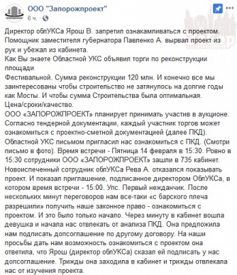 В Запорожье одна из фирм, которая собирается участвовать в аукционе на реконструкцию площади Фестивальной, обвиняет директора областного управления капитального строительства в том, что им не дали возможность ознакомиться с проектом. Об этом в сети сообщает ООО "Запорожпроект".