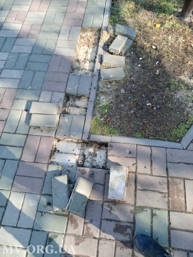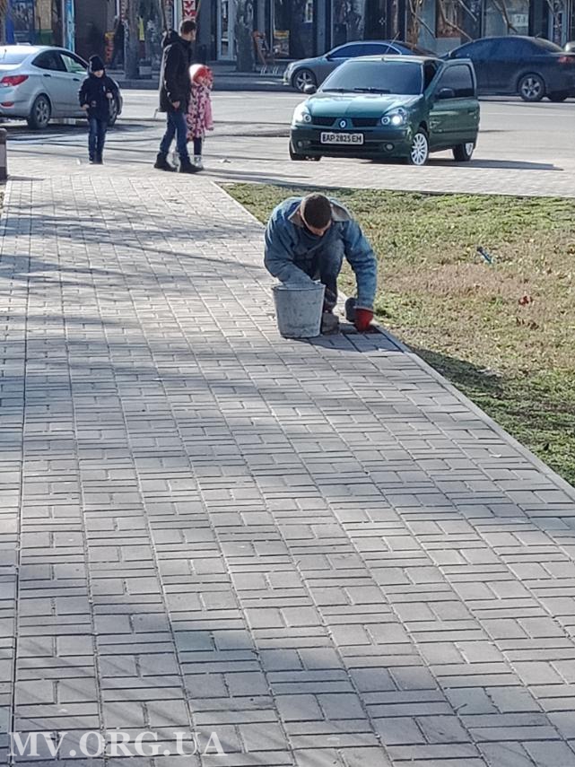 В Мелитополе на пл. Победы коммунальщики подклеивают расшатавшуюся тротуарную плитку. Фотографией неспешной работы строителей поделились в редакцией сайта MV читатели.