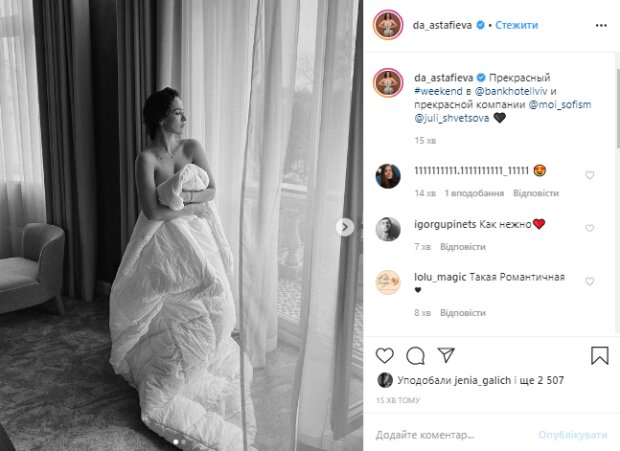 В сети у певицы появились невероятно нежные фотографии, которые тут же оценили поклонники. На кадрах Даша Астафьева предстала в обнаженном виде, прикрывшись одним одеялом. Певица сделала серию из двух снимков в черно-белом цвете с одного их отелей Киева. На первой фотографии она стоит голая в большом белом одеяле, всматриваясь в окно. Второе фото получилось намного откровеннее, так как на нем она вышла на балкон, прикрывши только переднюю часть тела, при этом ее спина, вплоть до пятой точки, была без одеяла. Эти фотографии показали поистине шикарную фигуру украинской певицы.