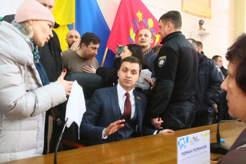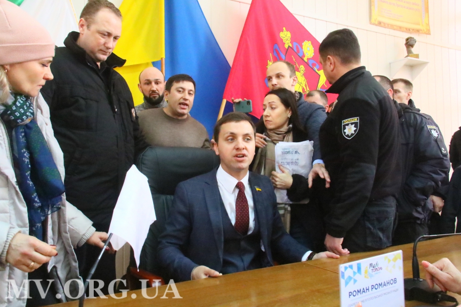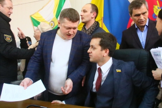 В Мелитополе в конференц-зале мэрии первый признак грядущих выборов - потасовки и блокирование трибуны.