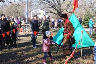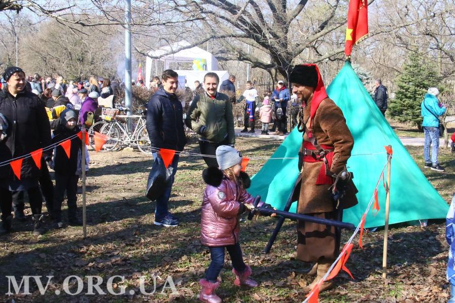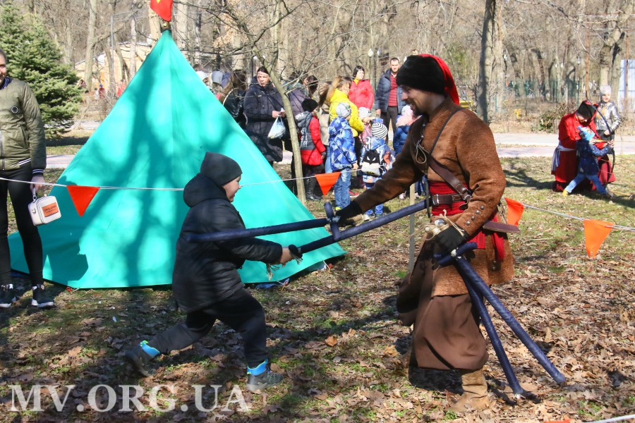 Участники национального шоу приехали к нам из Днепра. Пока жарятся блины, казаки развлекают детвору. Здесь и стрельба из лука, и традиционные и очень привлекательные для мальчишек битвы мягкими мешками и мягкими же мечами.