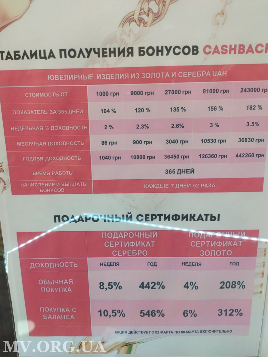 - Я заходил туда. Сложилось впечатление, что это финансовая пирамида чистой воды. Цены на золото у них минимум в двое выше, чем у нас. А серебру, что у нас можно купить за 400 грн., у них стоит 1600 грн. Персонал не подготовлен. Они не понимают профессиональную речь, и ничего не могут рассказать об изделиях. Рассказывают только о кешбэке. С экономической точки зрения основания для таких высоких процентов нет. Тем более не понятно, кто это продает. Нет уголка покупателя, на документах нет имени предпринимателя и реквизитов. Кроме того, есть вопросы по законности. Они, по сути, оказывают финансовые услуги, но этот вид деятельности отличается от торговли ювелирными изделиями на него нужно разрешение, – говорит эксперт.