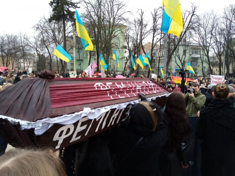 В Киеве начался марш женщин. Их противники принесли гроб феминизма