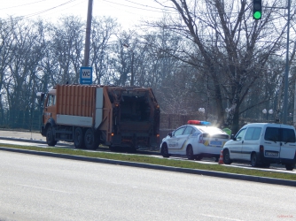 Свидетели сообщают, что при обгоне водитель мусоровоза врезался легковушку, тем самым нанес механические повреждения авто — пострадал багажник с правой стороны. В салоне авто находилось 4 человека, в том числе и ребенок. К счастью, никто не пострадал. На место происшествия работала полиция.