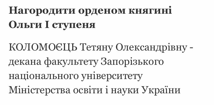 Так, орденом княгини Ольги І ступеня наградят Коломоец Татьяну Александровну — декана факультета Запорожского национального университета.