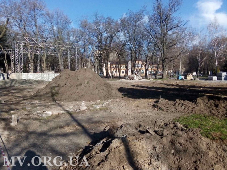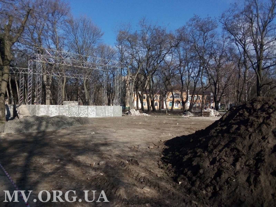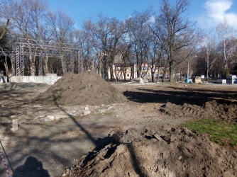 Сейчас в зоне отдыха под укладку тротуарной плиткой подготавливают территорию вокруг эстрады. Чтобы плитка со временем не осела, следует произвести масштабные подготовительные работы, засыпать и утрамбовать будущий "зрительный зал".