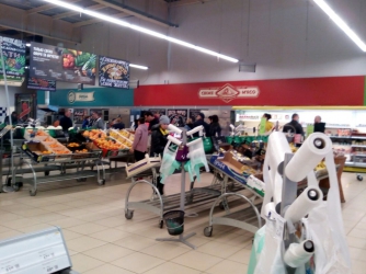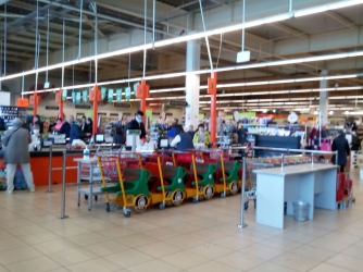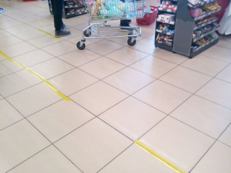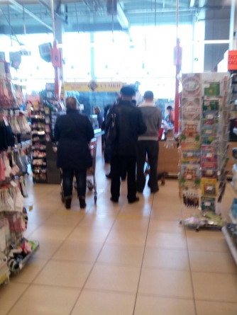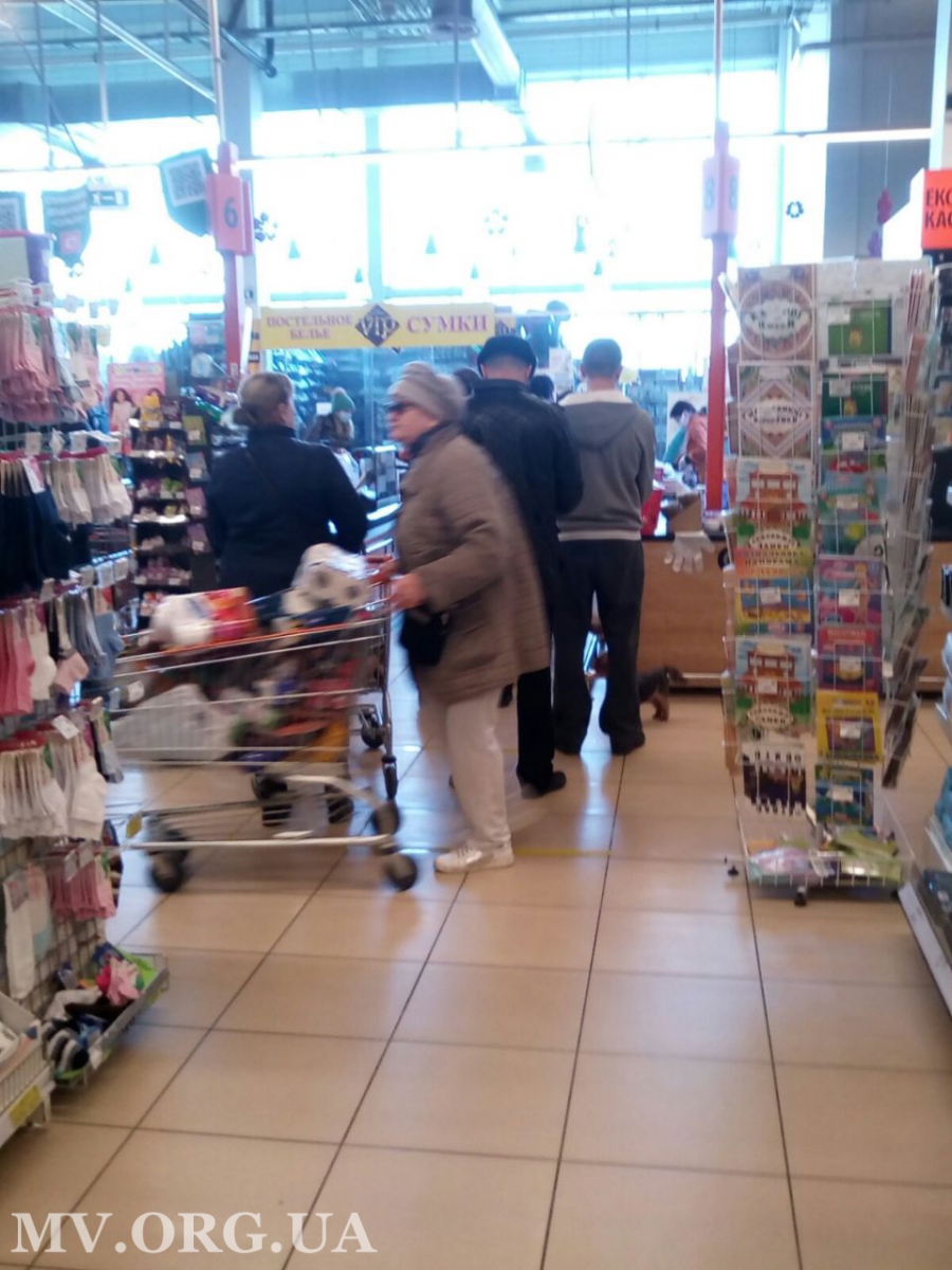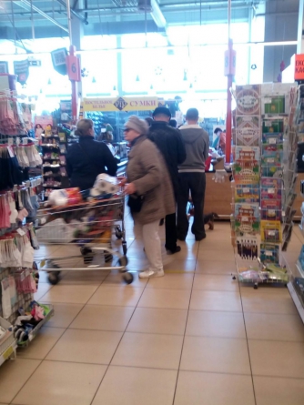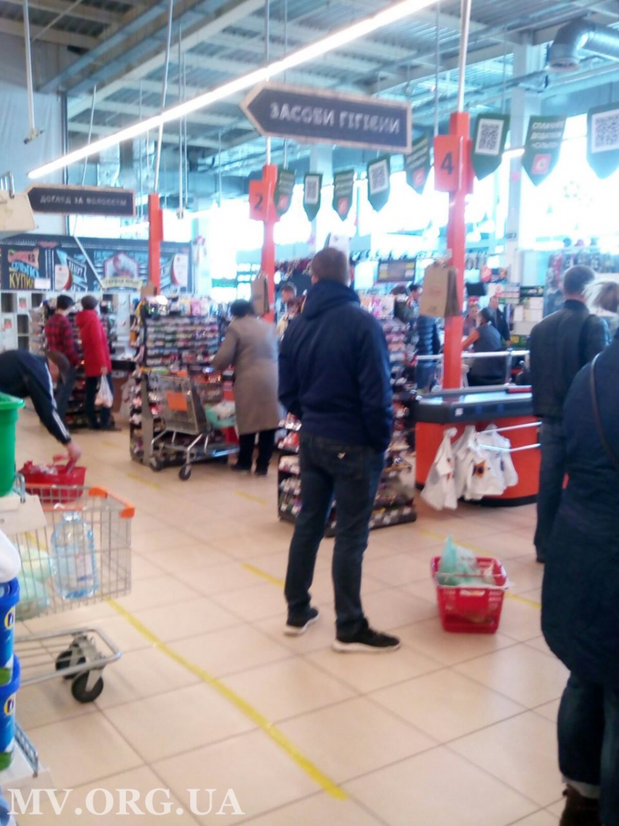 Начнем с супермаркетов. Супермаркет Сильпо, который на улице Интеркультурная, дисциплинированно встречает посетителей, при этом ограничение по количеству вошедших внутрь супермаркета с утра не было. В зале находилось более 50 человек, однако они все держали, так называемые, социальные расстоянии — не менее 1.5 - 2 м друг от друга. Этому помогали и линий, которые появились на полу супермаркета. Больших очередей нет. Наибольшей популярностью пользовалось мясо — именно там собралась самая большая толпа. Также не совсем заполненный витрины с крупами, но ситуация для супермаркета, в принципе, обычная. Интересно, что, после каждого покупателя, кассиры дезинфицируют своё рабочее место — протирают его дезинфектором. На улицах людей не много, но сказать что их совсем нет - нельзя. С утра пешком ходило мало людей, возле супермаркета стояло достаточно много машин.
