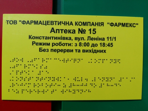 В с. Константиновка (Мелитопольский район) посетителей аптеки по ул. Главная встречает вывеска, написанная шрифтом Брайля. Порадовал нововведением жителей самого большого села Европы один из аптечных пунктов сети «Фармекс».