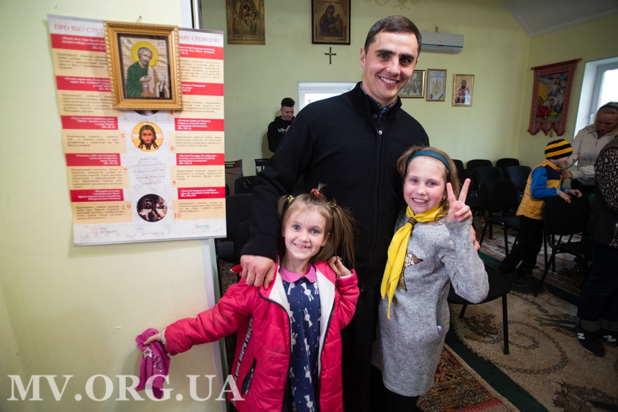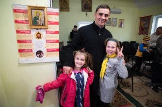 Отець Олександр Богомаз з дітьми під час служби у храмі Пресвятої Богородиці.