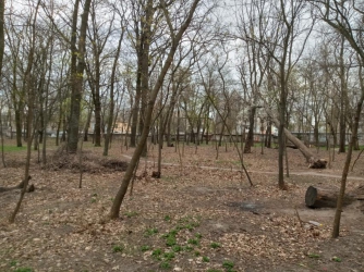 Сухие ветки, поваленные деревья и кучи земли - именно так выглядит территория за спортивными полями в районе места для выгула собак.