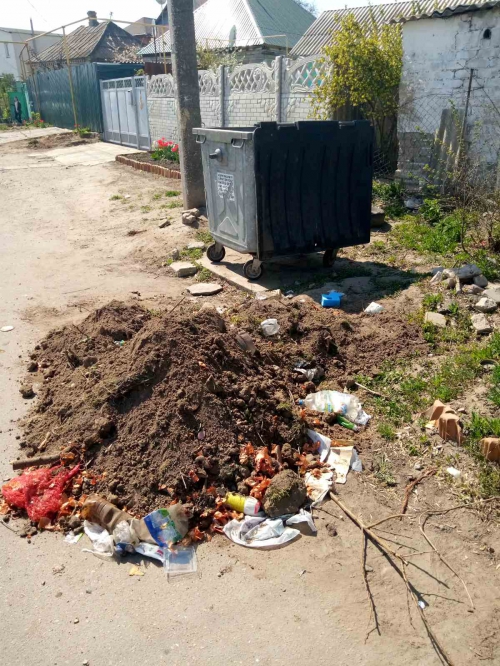 Как уверяют местные жители высыпали его туда коммунальщики, которые должны бы мусор вывозить. По словам очевидцев из-за того, что кто-то накануне насыпал в бак земли, подъемник спецавтомобиля не смог справится с контейнером. Тогда сотрудники ООО «Умвельт-Мелтополь» решили освободить его от содержимого по другому.