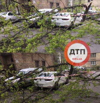 Уже упало несколько деревьев, временная конструкция на Подольском мосту и желтой мглой затянуло все небо