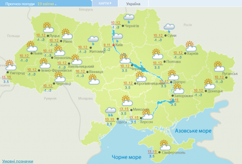 Согласно прогнозу Укргидрометцентра, завтра на территории Украины осадков не ожидается. В то же время уже на Пасху, 19 апреля, в северных регионах (Киевская, Черниговская, Житомирская, Сумская области) и в Одесской области могут пройти дожди.