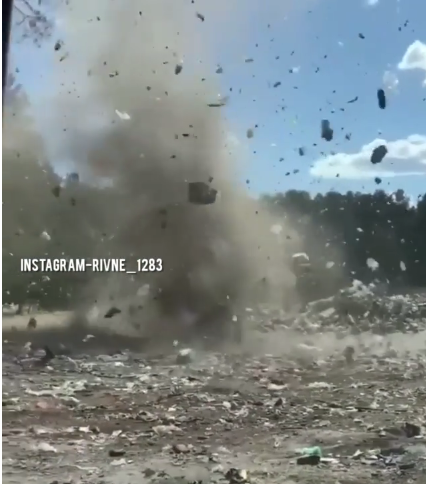 Инцидент произошел в городе Костополь. На кадрах можно увидеть, как посреди свалки кружится смерч из частиц пыли и песка, захватывая лежащий на земле мусор.